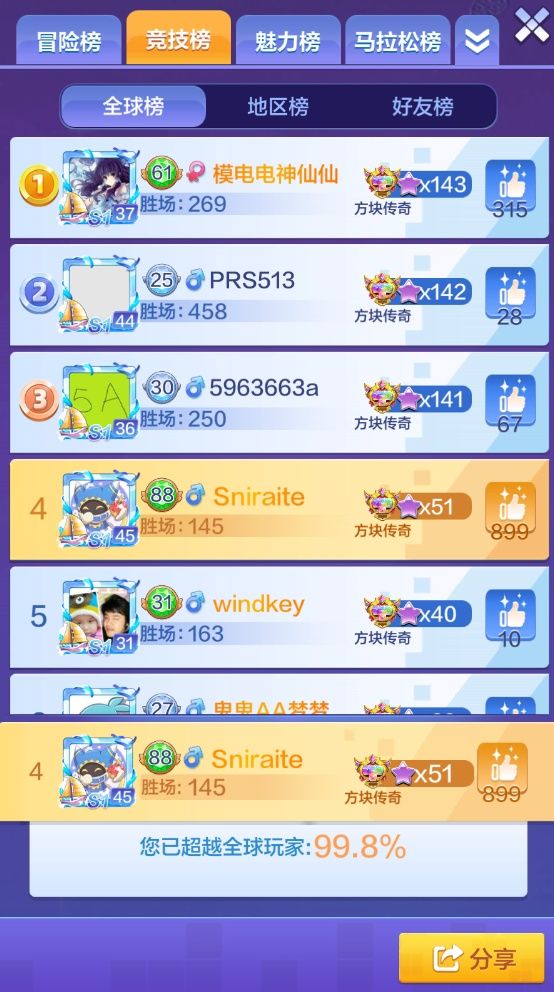 竞技对战玩法是很多方块迷的挚爱,消行又添堵总让人乐在其中难以自拔,这也许就是方块PVP竞技的魅力所在吧!手Q霸榜“模电电神仙仙”凭借方块传奇143星荣获第一名,看来竞技类才是大神喜欢的玩法;“PRS513”以方块传奇143星获得第二名,不知道努努力是不是也可以冲击下第一呢;第三名是“5963663a”,他胜场250获得方块传奇段位,相比身后其它前10名块友,可谓实至名归。