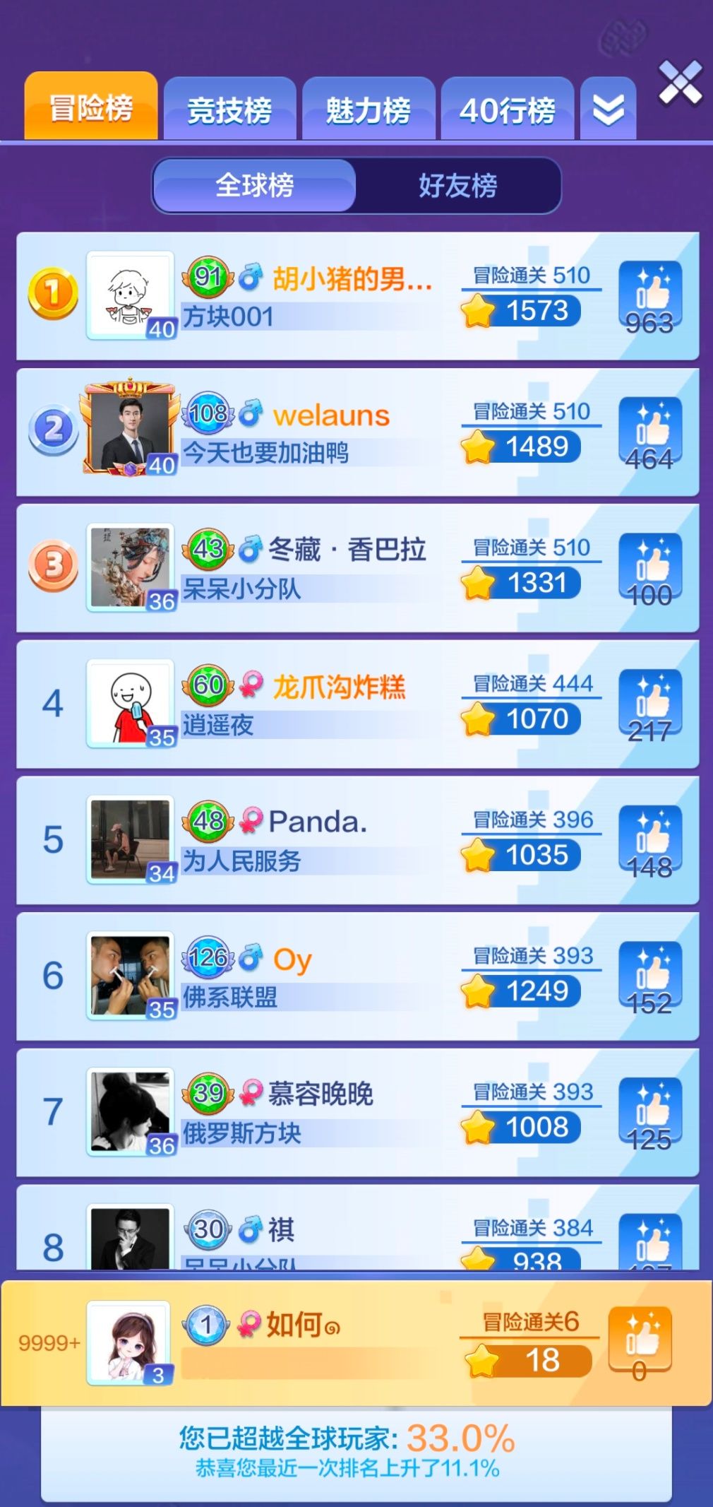 微信冒险榜闯关高手“胡小猪的男友”以成功闯关510关获得总星数1573稳居第一名,稳健的发挥让人记忆深刻;第二名的“welauns”成功闯关510关获得总星数1489,他操块灵动多变也是以经验丰富见长呀;而第三名高手“冬藏香巴拉”,如此文艺的名字却以狠辣果断的出招征服众多方块迷,他成功闯关510关获得总星数1331,与前二名相差不多,如果时间再长点,鹿死谁手还真难说哦~