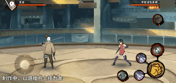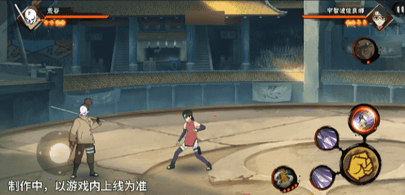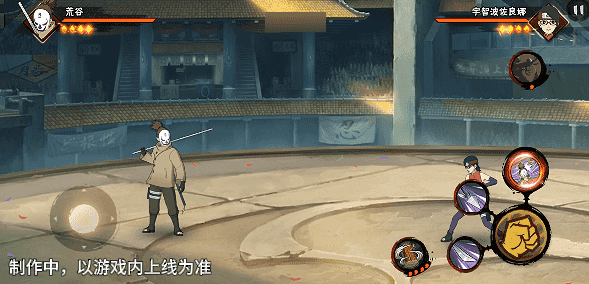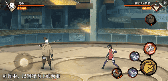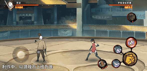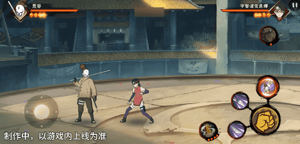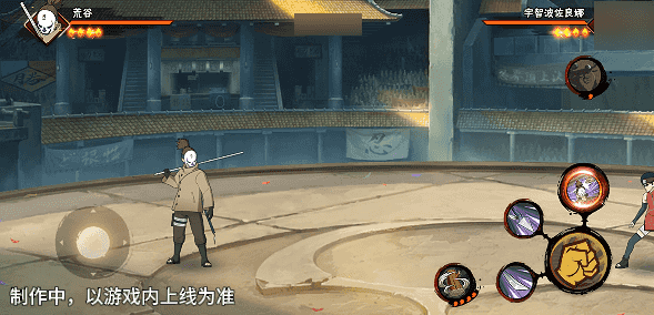 荒谷的普攻共6A,前3A挥剑平推,4A收剑为枪突进捅出,5A将长枪插地后一脚将其踢出,旋转数圈后用查克拉线拉回,6A持枪瞬身斩击。