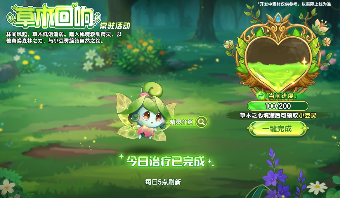 林间风起,草木回响 —— 当森林的低语渐弱,小精灵们正期盼一场温柔守护。踏入秘境,救助迷途的林间精灵,以善意填满澄澈的草木之心,唤醒沉睡的森林之力,小豆灵将与你缔结羁绊,共赴这场与自然的约定!治疗森林中的精灵,可获取草木能量,使用能量唤醒雕像,草木之心填满之后可获取一阶精灵——小豆灵。