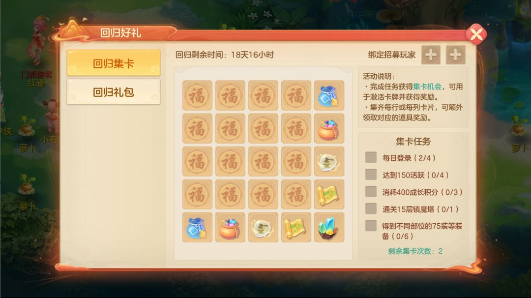 (2)离线14天的角色登录后可以触发角色回归,完成回归任务参与集卡,即可获取丰厚奖励