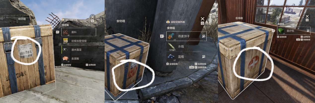 其实物资箱也分很种类,有普通物资箱,食物物资箱,医疗物资箱,这三种物资箱分布的区域还有数量也不一样,顾名思义各自物资箱里面刷新的物资也不一样。