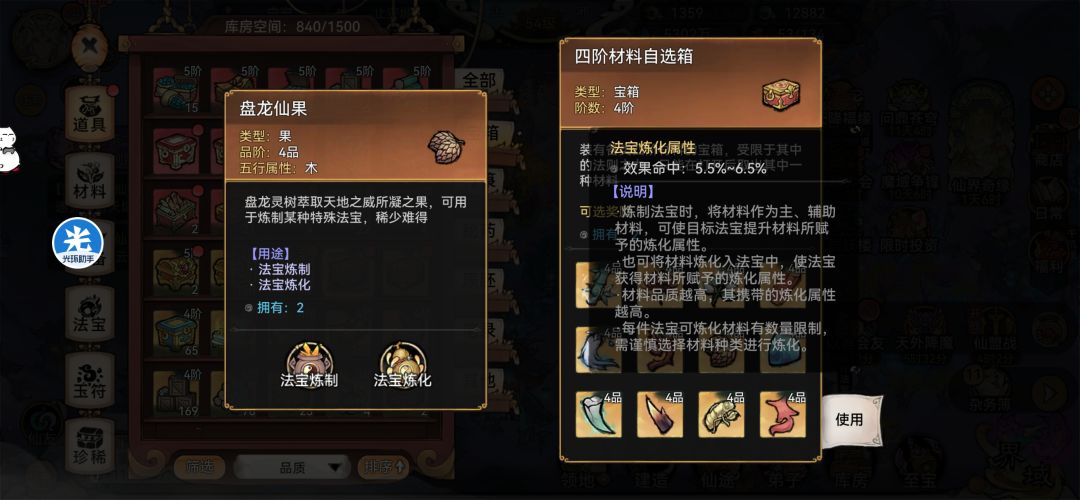△四阶法宝锻造:选择四阶丝或四阶羽作为主法宝,副材料放四个四阶果