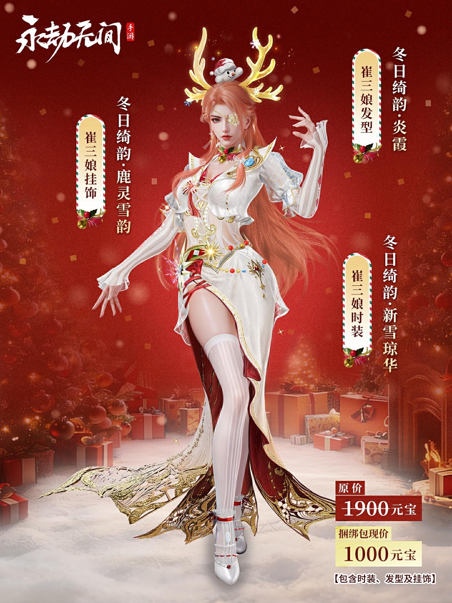 1、新增崔三娘捆绑包【新雪琼华捆绑包】。捆绑包内含崔三娘极品时装【冬日绮韵·新雪琼华】、崔三娘极品发型【冬日绮韵·炎霞】、崔三娘极品挂饰【冬日绮韵·鹿灵雪韵】。捆绑包原价1900元宝,折扣价1000元宝。单独购买对应单品即可享受折扣,购买捆绑包将享受更多折扣。