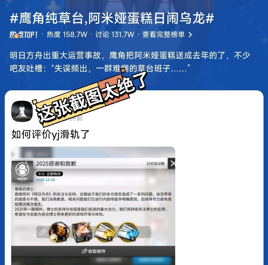 原因系在今年的女主阿米娅生日庆祝中,官方将女主阿米娅送给玩家的蛋糕设置出错