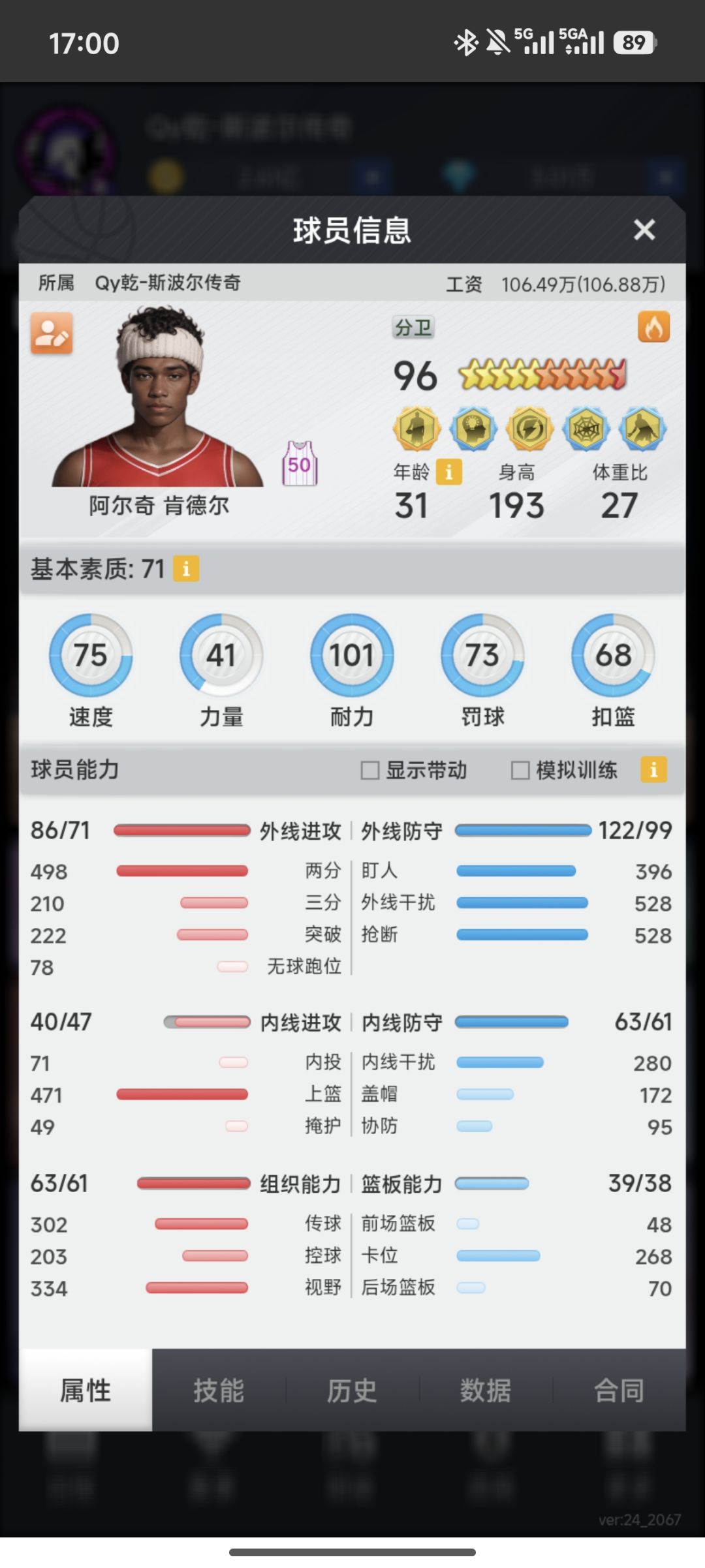 细节:高后仰高扣篮(防反会增加上篮),全员带前板,遇到二突队用防反进一步增强篮板球,遇到32队用绞肉(因为32队追求系数,闸的板子不会大),进一步增强后仰率(及命中率)拼得分,这样还有一个好处,小前类型的球员内防也不小,这样更不怕内投了。完美,最后附上全员。