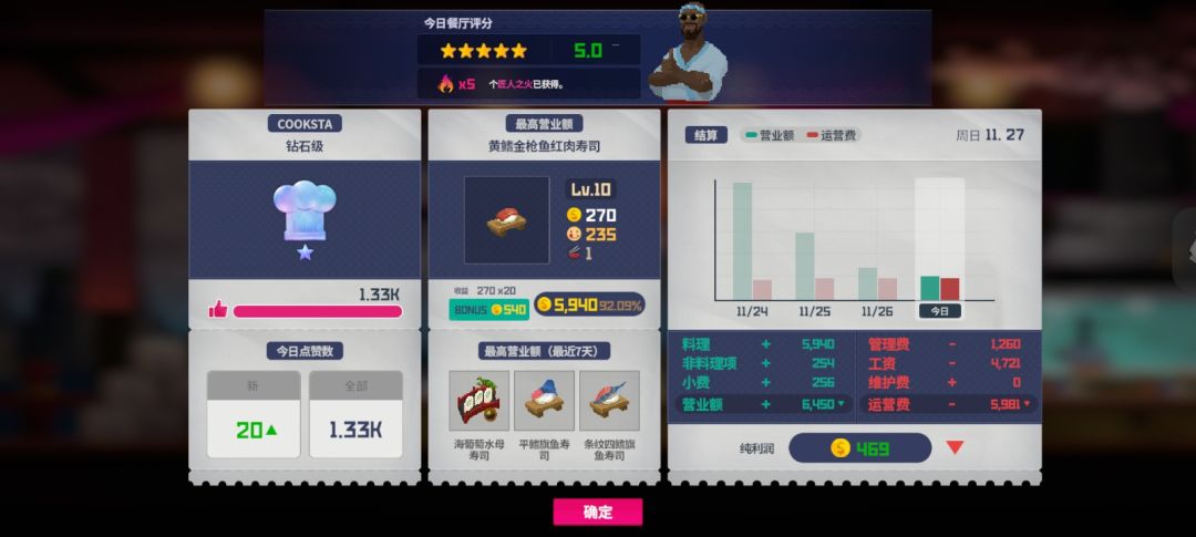 ②日式河豚冻:盘子数多,价格也不容小觑,满级666金币一份,可满足7位客人需求,主打量大管饱