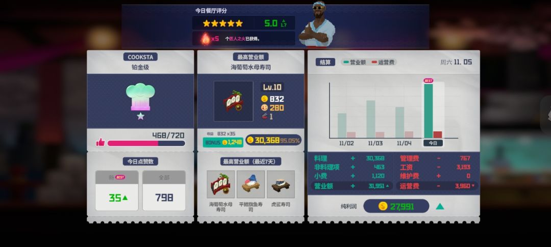 后期:①海葡萄水母寿司:目前最贵料理,但材料需要刷钟乳窟地形,员工需要派遣找盐,较为麻烦,但赚取与付出成正比