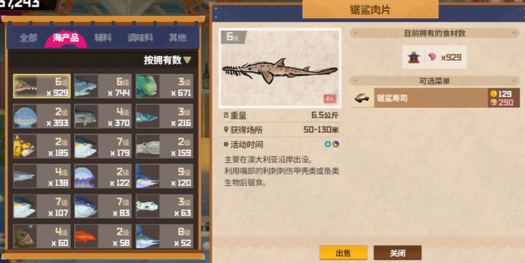 ③两种旗鱼相关寿司:继水母寿司下目前第二贵的寿司,但旗鱼都是概率刷新,保不准是否能每天满足客人需求量(平鳍旗鱼在地图左下方遇难船内部刷新,有海流涌动声则说明刷新了;条纹四鳍旗鱼则是0~50米水域随机地点刷新,通常刷在右侧上方)④两种金枪鱼相关寿司:同样存在概率刷新的问题,但一次至少刷新3只,多则10只,属于是遇到一次富一次,通常在0~50米水域随机地点刷新,偶尔会刷新在50米~130米水域与0~50米的交接处