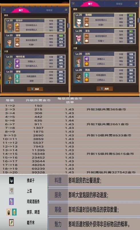 升级员工,在5级、10级、15级和20级都会给新菜谱,但不是所有员工都会提供新菜谱哦,这边还是那句话,留在黄金和铂金刷钱静待正式版即可,现阶段升钻石纯纯坐牢,经测试,不卖单价270金币一份的料理基本在钻石赚不到多少金币,当然,肝帝除外,但还是说:硬肝伤身伤神,正常游玩体验最好。