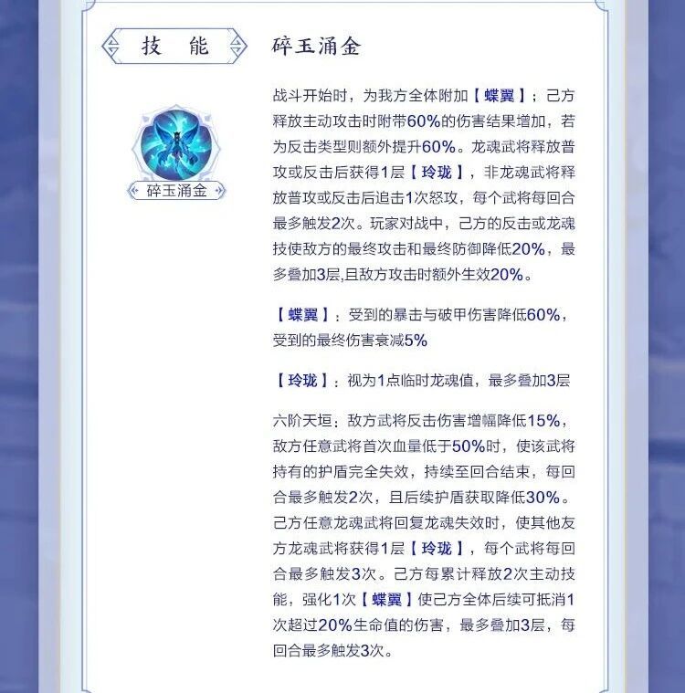 在蝶灵的帮助下,龙魂武将能够通过普攻和反击获得额外的临时龙魂值【玲珑】,每个武将每回合最多2次,该回复方式的最大优势,是通过改头换姓,能有效规避掉各类针对龙魂回复的负面效果,让对方无法降低/吸取/反制,是非常稳定可靠的回复手段,也算是另辟蹊径了。