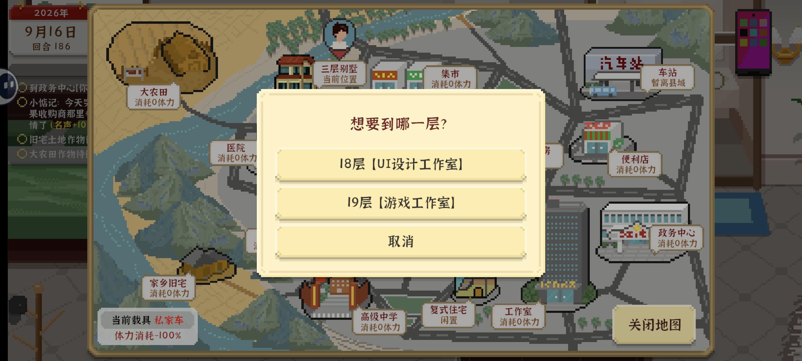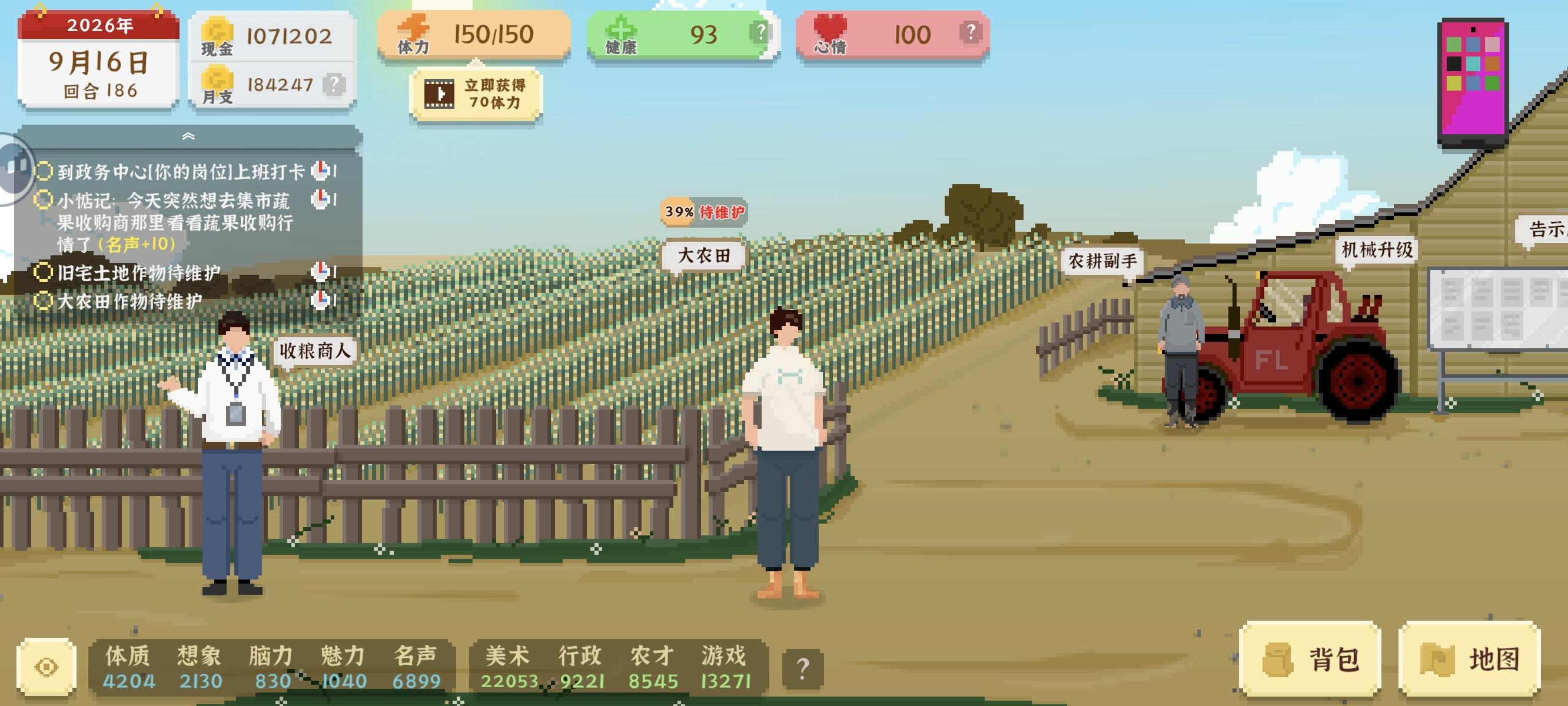 一开始我选一开始我选择了提高自己的设计能力和慢慢种田,任务有些我没做。不过我坚持每天,在体育馆和学校进行活动,体育馆三千米可以提高体力上限,摸猫猫可以提高你的活力,但也容易被抓,学校有板凳坐着休息还有抬杠也可以休息,后面有一些钱了,可以先开设计工作室,把前同事拿过来,就开始慢慢赚钱了,等你有钱了,你就可以把大农场开启,再去找亲戚来帮忙,你就可以完全过着每天有钱的生活了,这时候你可以开启你的考公生涯和职业比赛,职业比赛每天锻炼提高经验以外,还可以通过抽卡刷VIP经验,可以提高血量和攻击力。考公的话还是比较简单的,基本上刷1000左右的题量就差不多了,然后我就找了一个女朋友在一起了,其他角色基本上都是我的暧昧对象。