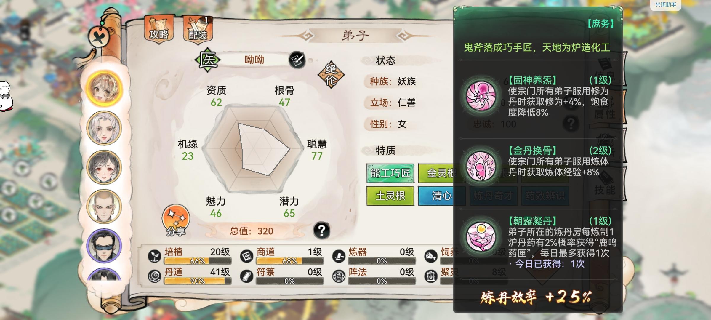 喂丹:喂境界丹时可将弟子设置为掌门,同时切换高等级洞府,佩戴两个资质+3玉符,可以最大程度的节省丹药