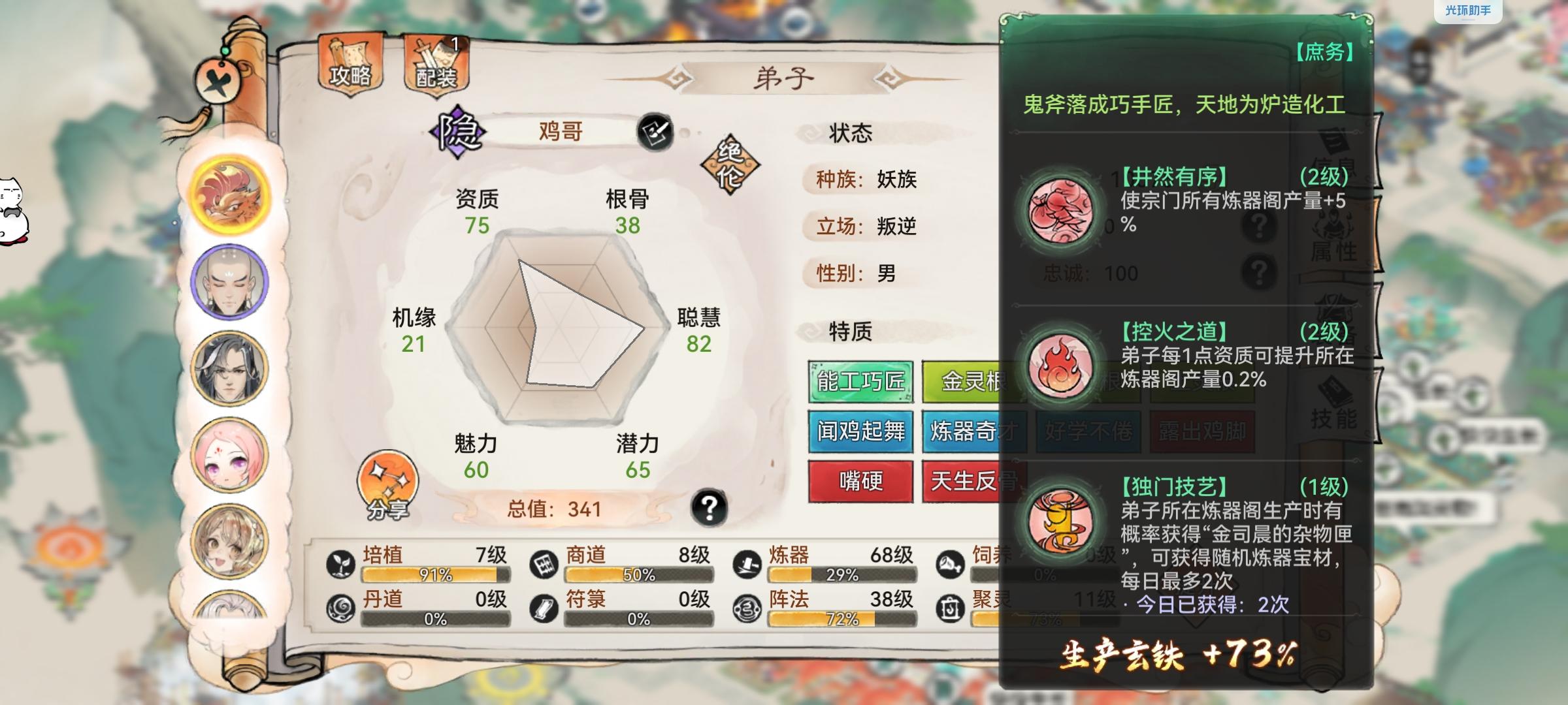 各位祖师大家好,我是偶尔清醒,最强祖师这款游戏内容复杂,暗坑很多,在游戏的过程中,我发现很多祖师过于追求战力,在生产经营方面有所忽视,殊不知生产经营也是祖师体系中非常重要的一环,生产弟子选择正确 ,对于祖师拿下春华秋实排名、宗门建设以及飞升都有着巨大帮助,古人云:择生产弟子得其良者,于祖师兴盛宗门基业,大有裨益。下面是个人对于生产经营的一些拙见,如有理解不到位的地方还请大家批评指正