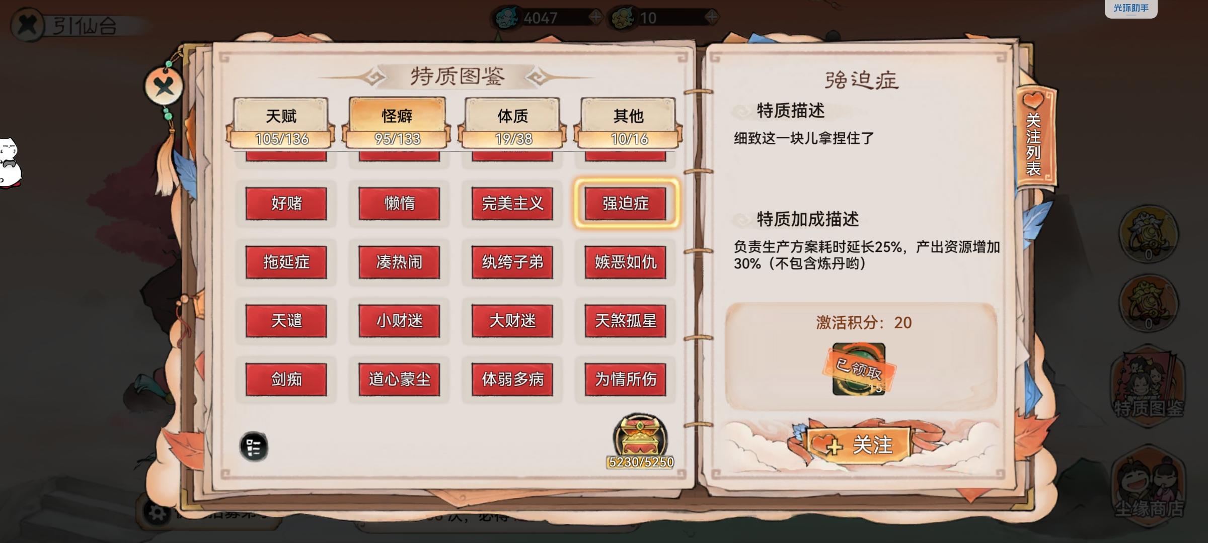 强迫症词条:相同条件下 假设一天生产产量为100 无词条弟子一天产量为100% 专业经验获取效率100% 有词条弟子一天产量经过计算为104% 专业经验获取效率为80% 产量的增加非常有限 但专业经验获取效率降低的非常明显!因此不推荐(因为有些祖师可能对强迫症词条有误解,认为这是个好词条,所以在这里解释一下,其他的负提升词条不在此进行展示)