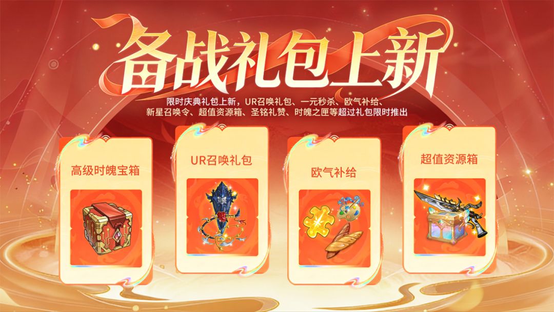 限时庆典礼包上新,UR召唤礼包、一元秒杀、欧气补给、新星召唤令、超值资源箱、圣铭礼赞、时魄之匣等超多礼包限时推出!
