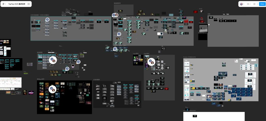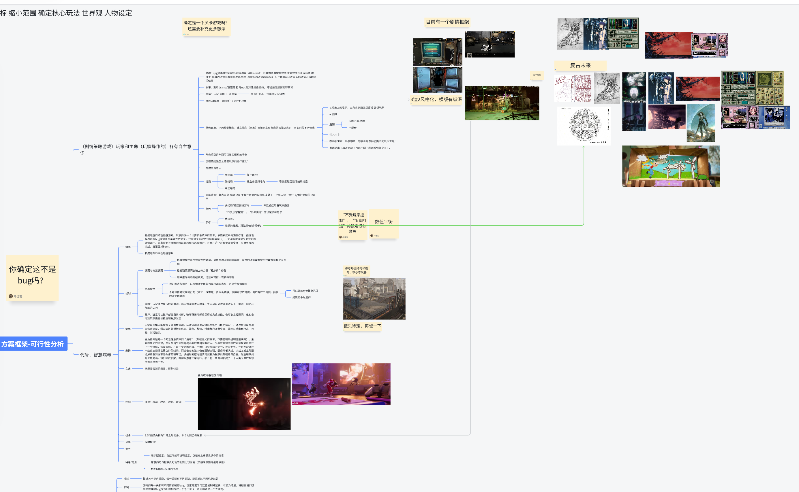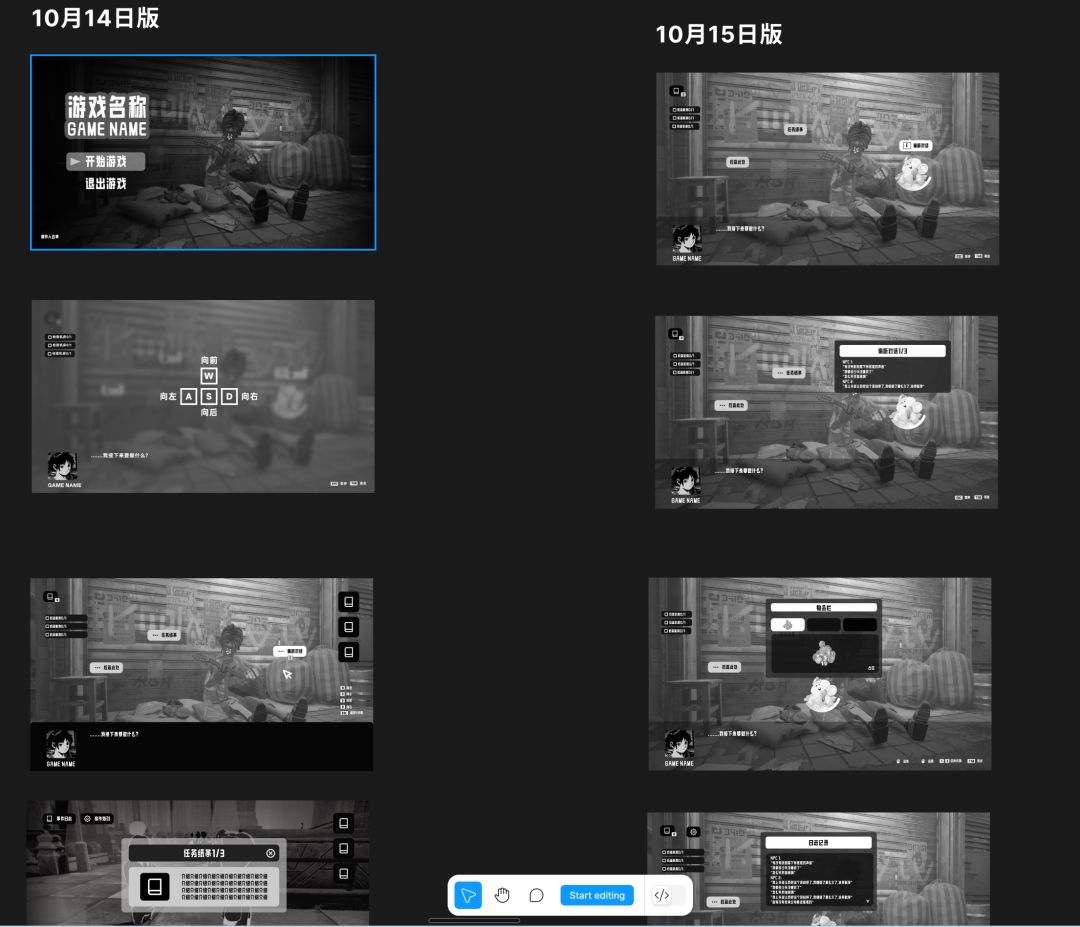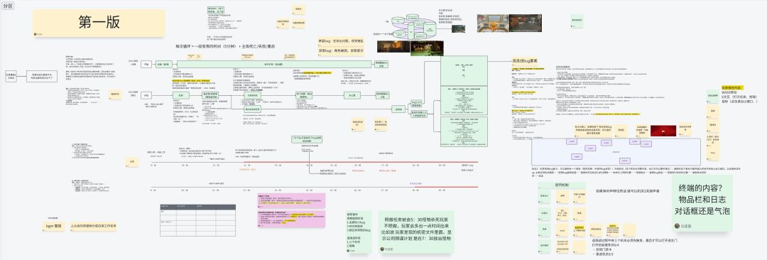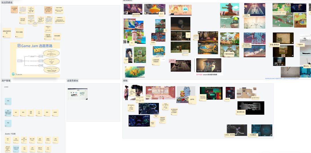 而在游戏设计方面,这一次并没有产出常规的策划案,而是使用飞书画板+流程图的方式脑暴和描述游戏内容及流程。换句话说,这次的游戏是在写写画画中做出来的。