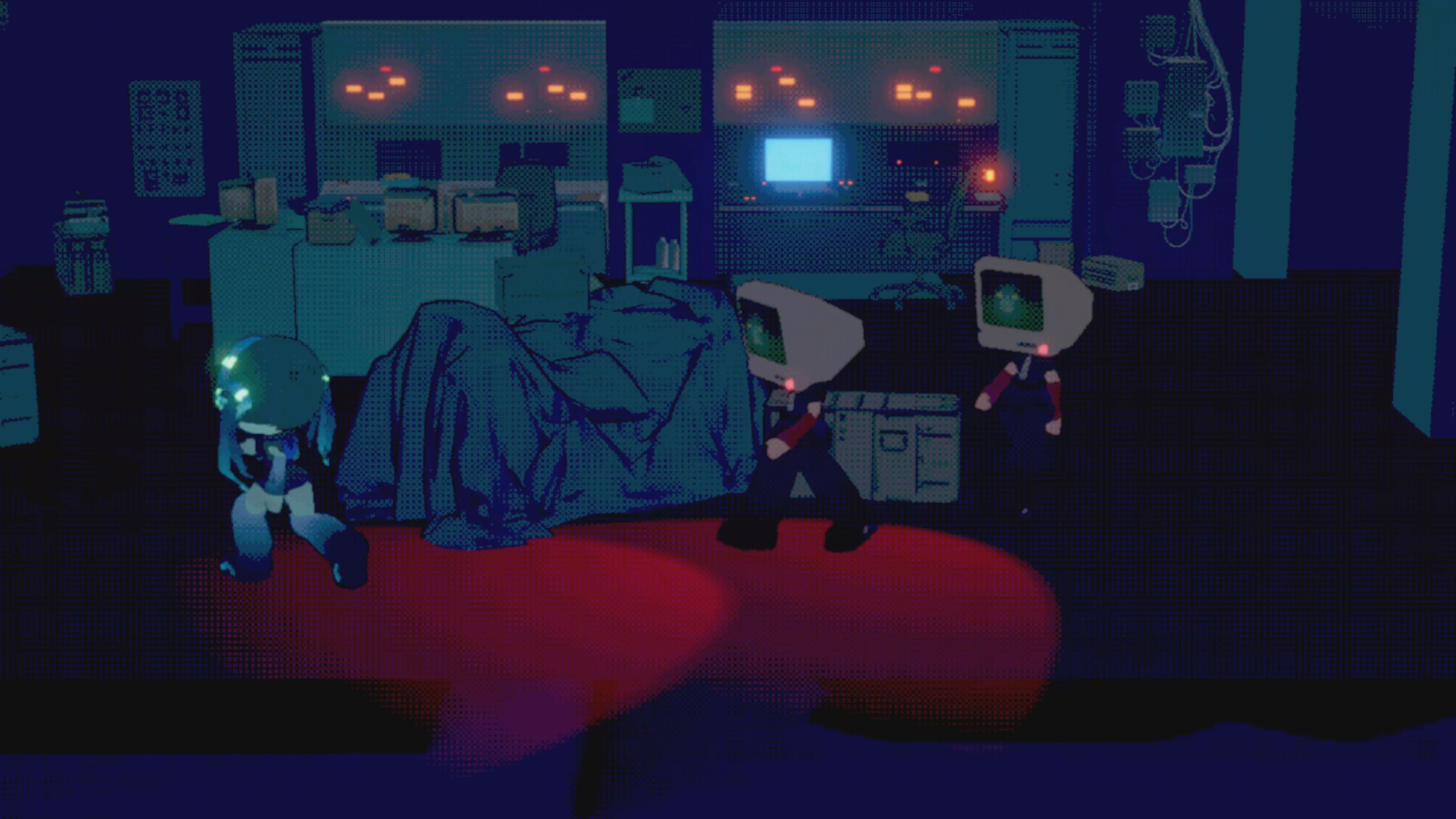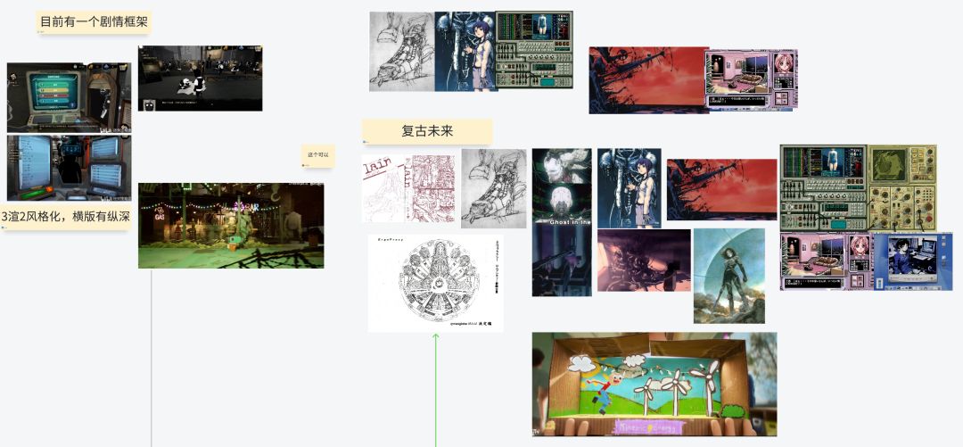 主题公开前我们粗略讨论了大致感兴趣或者可行的方向,主题公开后大家提出了几个方案,最后选择的是美术组的几位同学提出的方案,她们想要尝试"有纵深的横版画面“,风格化上则想尝试“复古未来”(past future)风格,概念设计上,希望能做出一种“主角反叛玩家操控”的meta效果、并且含有“多周目重复”的元素。作为参考的游戏有《旁观者2》(behold2)、《癫狂动物园》、《迷失》(Stray)等。