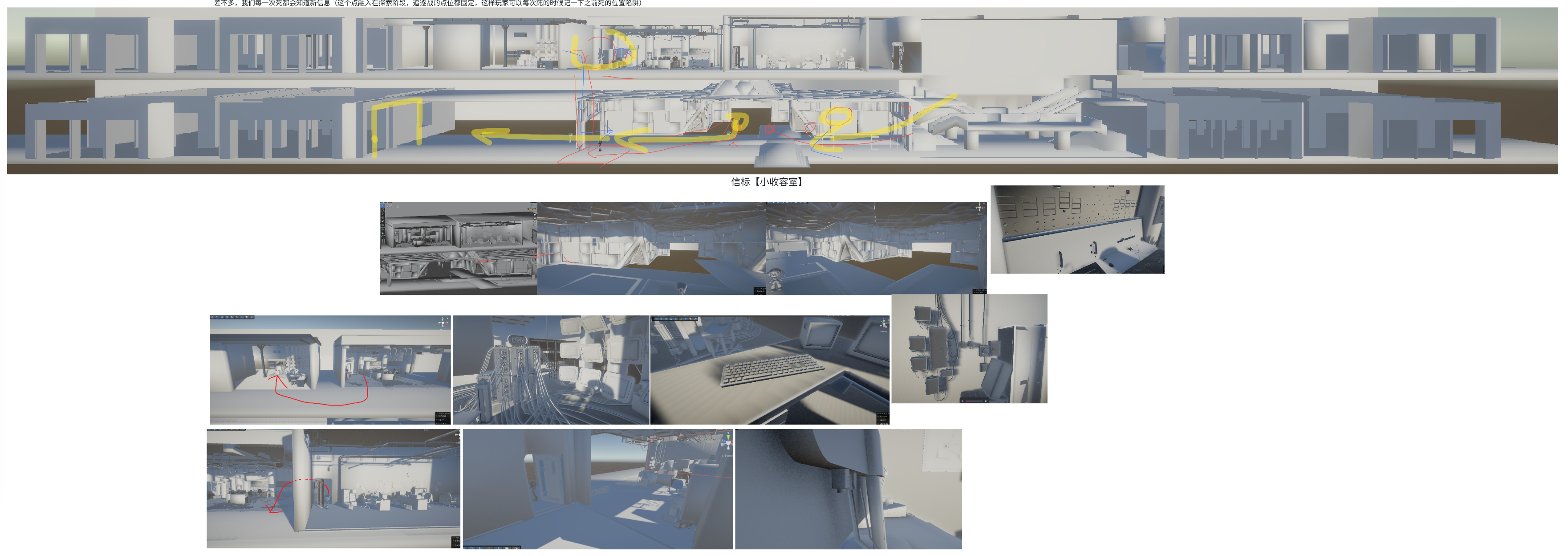而作为策划我们很快发现美术提出的方案有设计可行性上的问题。主要问题是核心玩法的缺失,参考的作品是侧重剧情的长流程独立游戏,而GameJam更需要短时间体现出一个明快的玩法。但是方向已经确定,既然是GameJam就应该大胆尝试。因此策划花了一些时间思考和拟定剧情故事,但是发现美术原定的“bug”,即“主角违背玩家意志”这一点很难体现在玩法体验上。于是策划又在原有的方案上做了几次调整,首先是找了《12分钟》《house》这样的参考,希望做成短流程大量重复的解谜叙事。但是很快发现方案难度很大,短时间设计不出来。于是又修改方案为带有分支线性流程,通过简单任务推动,并且决定加入追逐战这样的特色环节。而后面设计流程的时候也遇到几次障碍,后来在协作下完成了。