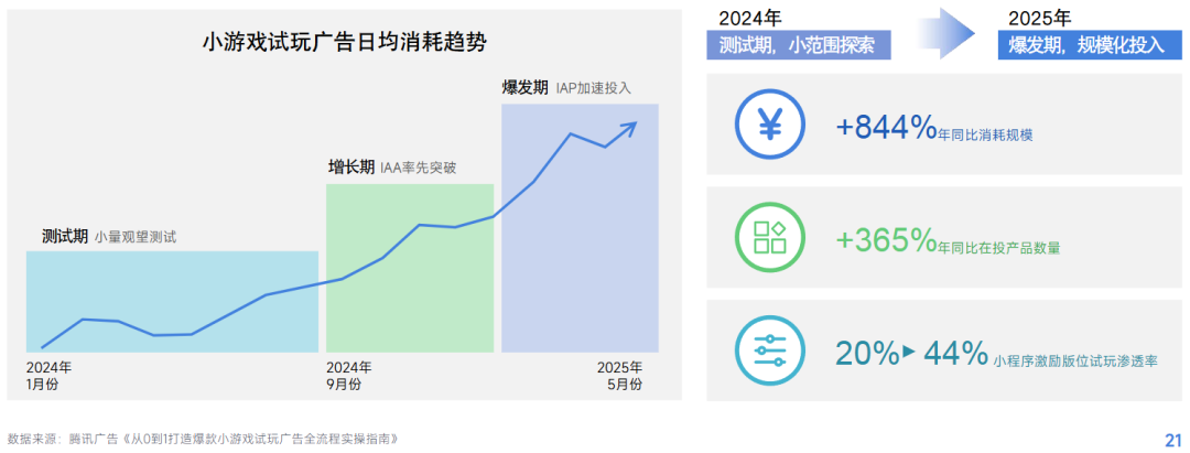第四,试玩广告「彻底爆发」,今年微信小游戏试玩广告日均消耗同比增长844%。试玩广告自2024年1月小规模出现,去年Q4被IAA率先大规模尝试,今年中旬IAP加速投入后彻底引爆,蜕变过程极快。