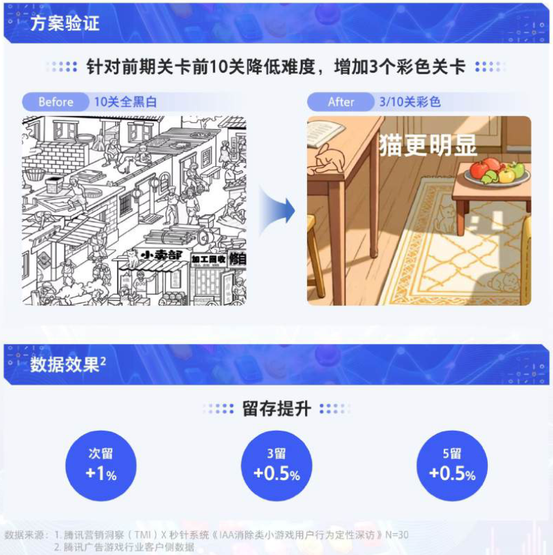 比如《找个喵》的新手调优,游戏前10关为黑白画面,但在增加三个彩色关卡后,次留提升了1%,三留、五留都提升了0.5%。类似的小改动汇聚起来,就能给游戏带来大幅的提升。
