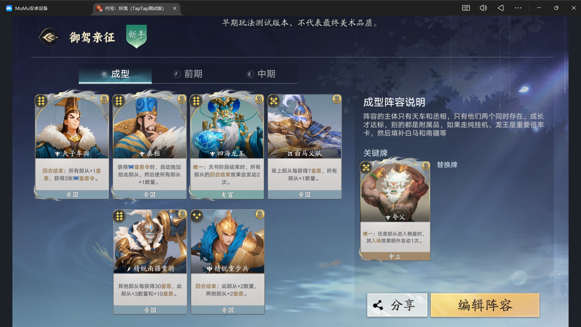 中期实际上是一个寻找天子和丞相的过程,在这个阶段尽可能活着(虽然找到天子和丞相也不一定能活),精锐重步兵作为回合结束流的前排比较出色,相比之下精锐羽林并不好用