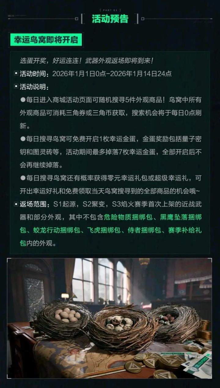 最香的是零元幸运礼包!抽中就能让当天鸟窝搜的商品全免费,相当于白捡物资,这波“免费接接接”的快乐谁懂?不过要注意,蜂医捆绑包、黑鹰坠落紫皮这些是不在返场名单里的,别跑空啦~