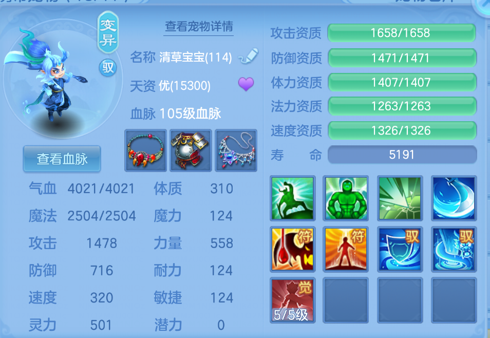 看到上面两个童子,其实属性不会差很远,如果带个好点的血脉和好装备,4技能的也能上1500攻击。那护符自己觉醒了一下勇士。