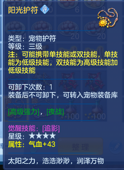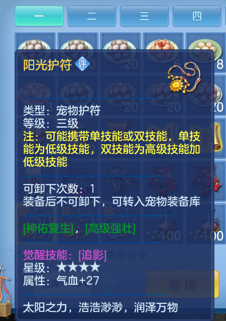 同时如果月光也是剑气配合上述有用小技能,和四级护符差别也不大。所以不必强洗四级护符,先随缘吧。日后有资源再慢慢洗,毕竟也就带1~2个剑气宝宝,现在特殊技能越来越多,都弱化了四级护符的作用了。10W可以洗很多有用的星光了。前期够用了。后期慢慢洗阳光,给好的宝宝。洗出血脉先,再洗对应的宝宝,再去洗护符,留着钱。先把宝石打上去。上段比啥都有用。