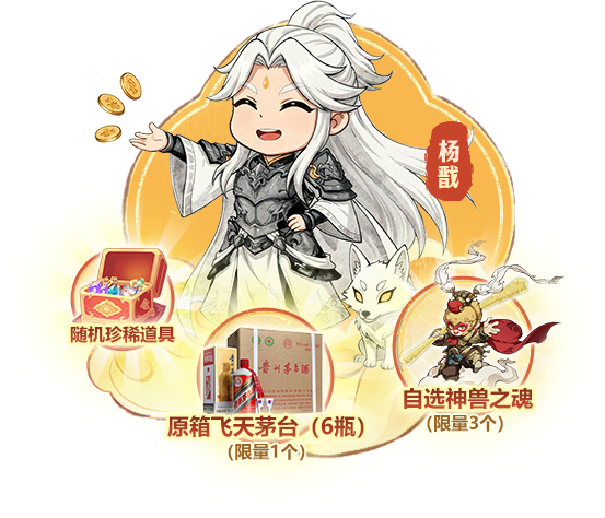 二郎神君杨戬神威盖世,为天命之人送上自选神兽之魂和原箱飞天茅台,祝大家新年战无不胜!