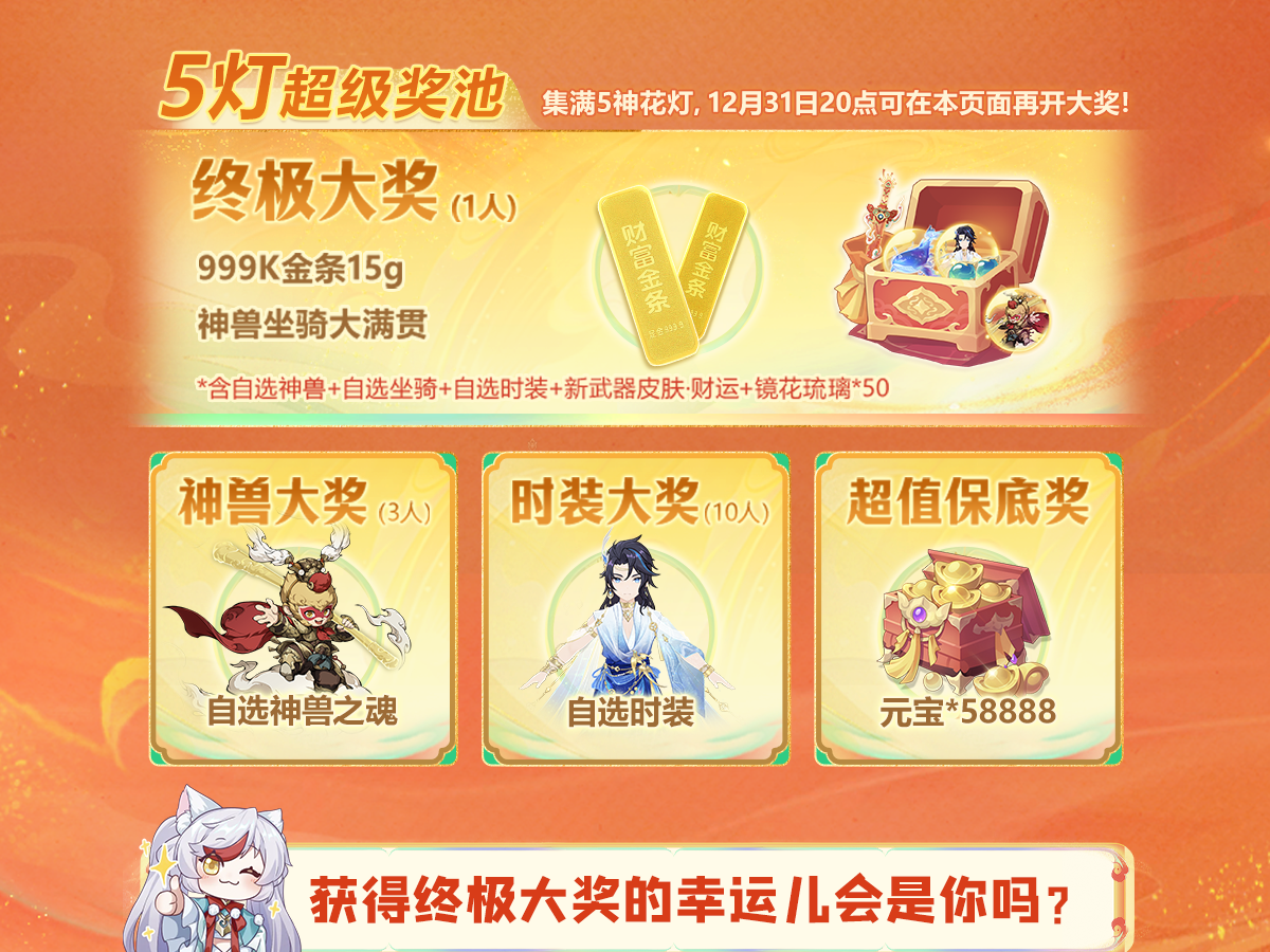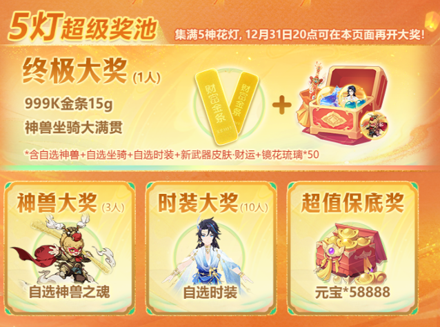 如果大人们集齐了5位神仙的花灯,还能解锁五灯超级奖池,内设神兽大奖*3份,时装大奖*10份,还有1个集15g金条和神兽坐骑大满贯于一体的终极大奖!保底得5888元宝!