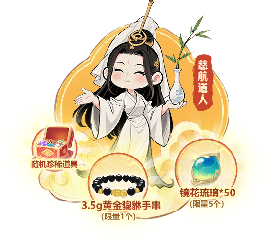 慈航道人护佑众生和乐,为天命之人带来50个镜花琉璃和3.5g黄金貔貅手串,祝大家新年福泽深厚!