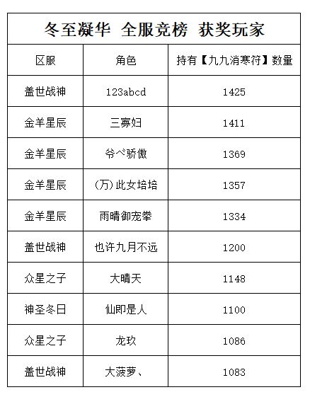 《世界OL》冬至凝华 全服竞榜 获奖玩家