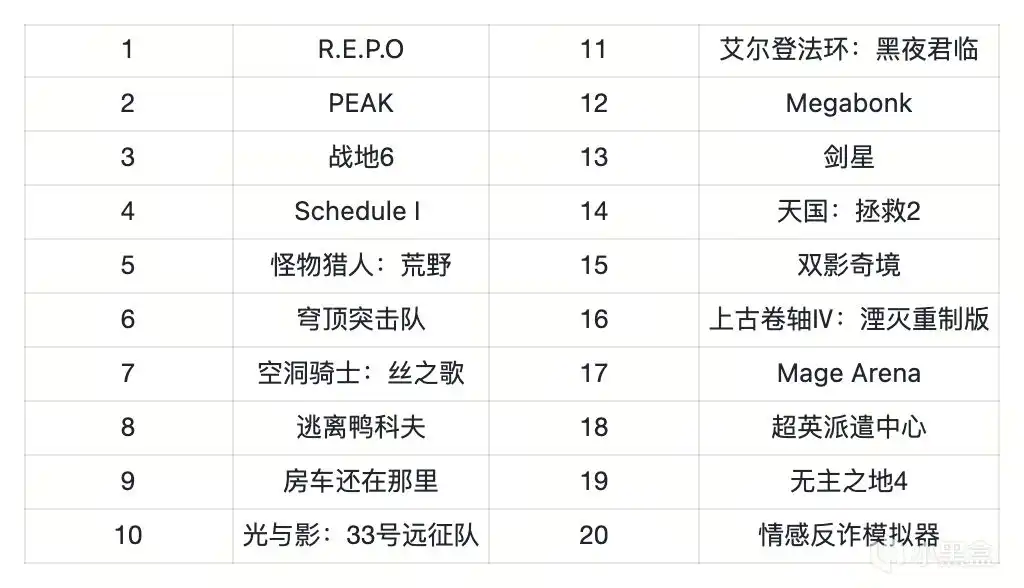 比起上一个榜单,排名上升的主要是那些价格更高的游戏。但在前10中,《R.E.P.O》《剑星》以及《天国:拯救2》等游戏,用质量与价格双口碑获得了应有的市场表现。