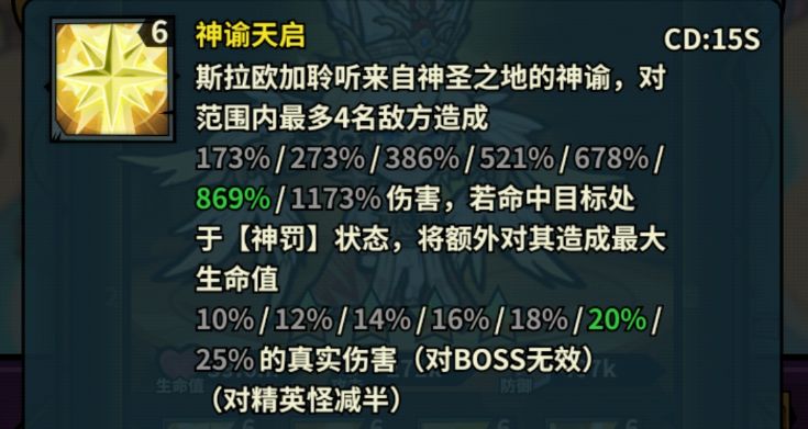斯拉欧加聆听来自神圣之地的神谕,对范围内最多4名敌方造成伤害,若命中目标处于【神罚】状态,将额外对其造 真实伤害(对BOSS无效)(对精英怪减半)