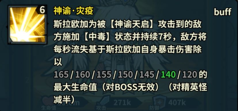 斯拉欧加为被【神谕天启】攻击到的敌方施加【中毒】状态并持续7秒,敌方将每秒流失基于斯拉欧加自身暴击伤害除以165/160/155/150/145/140/120的最大生命值(对BOSS无效)(对精英怪减半)
