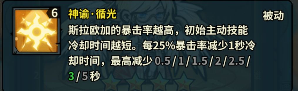 斯拉欧加的暴击率越高,初始主动技能冷却时间越短。每25%暴击率减少1秒冷却时间,最高减少5秒