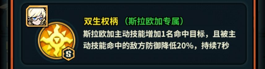 斯拉欧加主动技能增加1名命中目标,且被主动技能命中的敌方防御降低20%,持续7秒