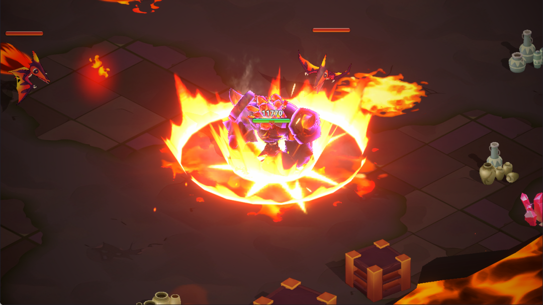 喷出数个熔岩,落地后造成中额爆炸伤害,每个熔岩爆炸后会产生1个火泡泡,火泡泡会缓慢靠近火焰魔像,并被它吸收,为它恢复生命值。