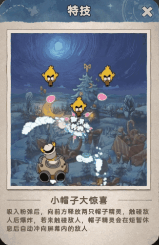 吸入粉弹后,向前方释放两只帽子精灵,触碰敌人后爆炸,若未触碰敌人,帽子精灵会在短暂休息后自动冲向屏幕内的敌人。