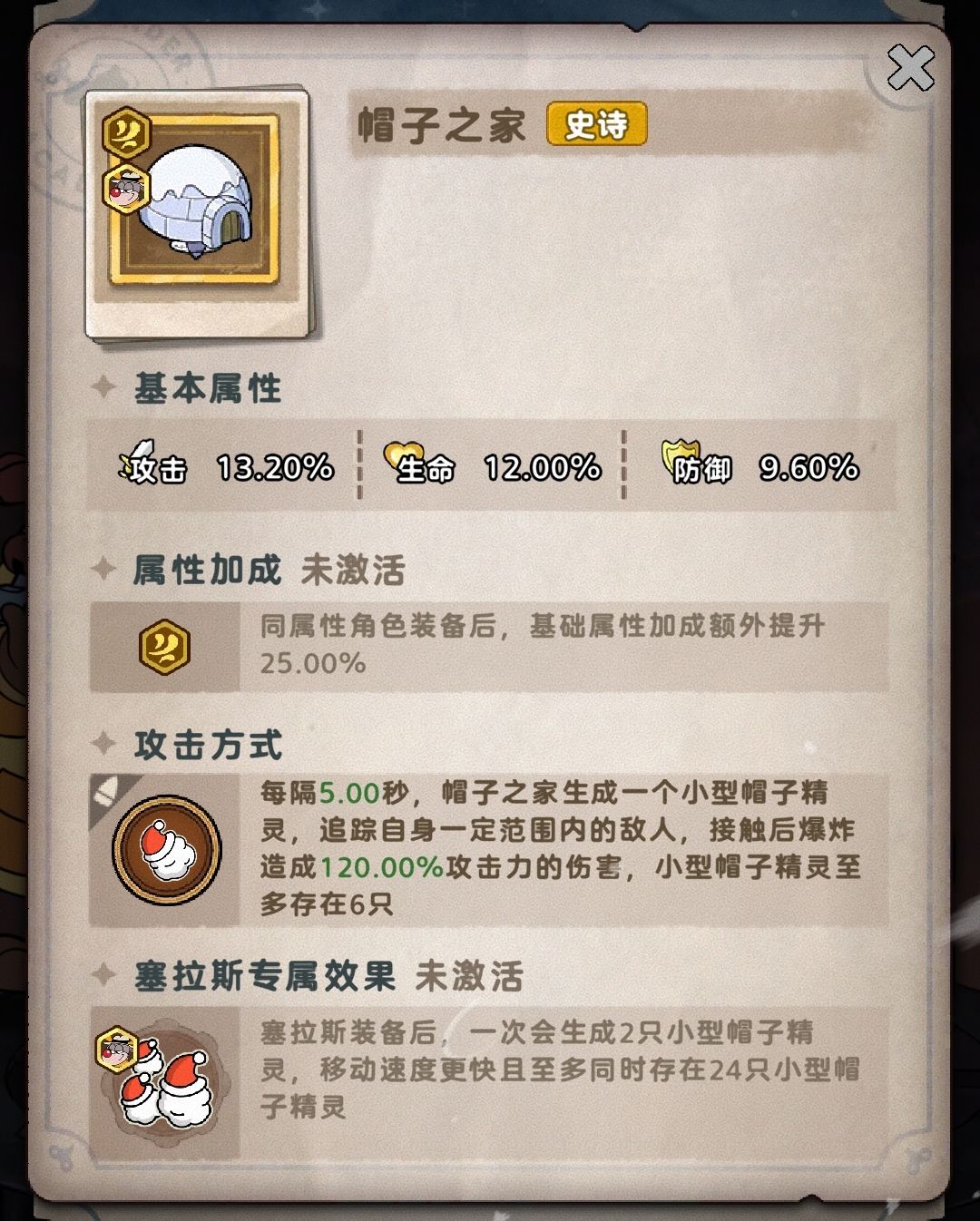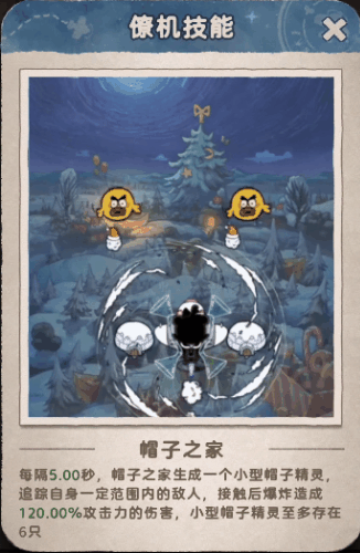 每隔一段时间,帽子之家生成一个小型帽子精灵,追踪自身一定范围内的敌人,接触后爆炸造成一定攻击力的伤害。