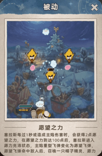塞拉斯每过一段时间或造成主炮伤害时,会获得愿望之力,在愿望之力到达一定层数后,塞拉斯进入愿力充沛状态,主炮重型飞弹变化为愿望飞弹, 愿望飞弹命中敌人后,召唤帽子精灵,充沛状态每秒会消耗一定的愿望之力