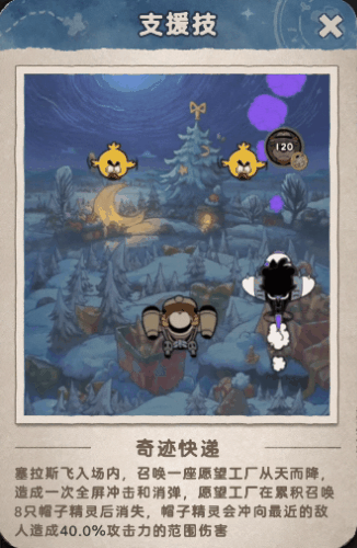 塞拉斯飞入场内支援阿瑟,召唤一座愿望工厂从天而降, 造成一次全屏冲击和消弹,愿望工厂在累积召唤多只帽子精灵后消失,帽子精灵会冲向最近的敌人造成一定攻击力的范围伤害。