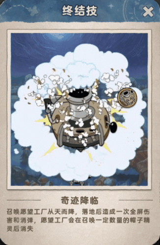 召唤愿望工厂从天而降,落地后造成一次全屏伤害和消弹,愿望工厂会在召唤一定数量的帽子精灵后消失。工厂将持续生成多波帽子精灵,发起一场彻底而理性的战场清洗。