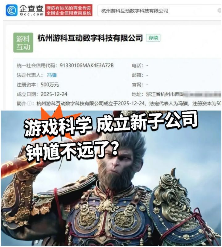 《黑神话:悟空》开发商游戏科学昨日12月24日新成立了全资子公司“杭州游科互动数字科技有限公司”。该公司法定代表人为游戏科学创始人冯骥,注册资本为500万元人民币(如图)。
