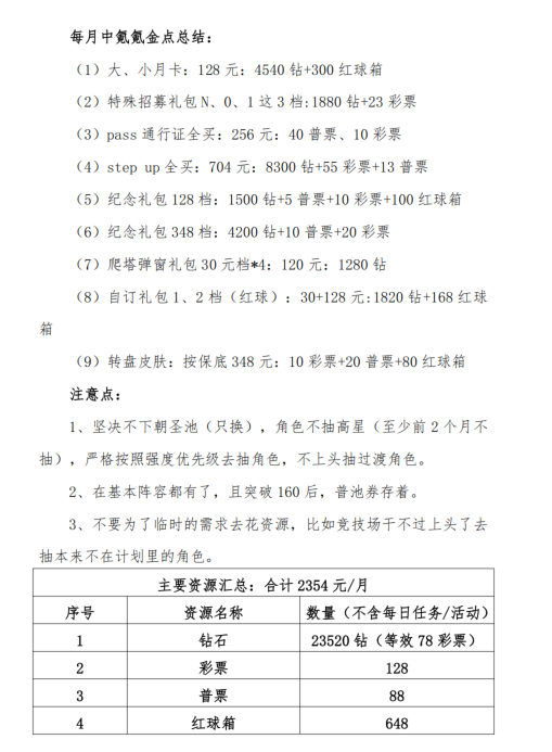 我这个图主要是针对第三种情况,即每个月千儿八百投入的玩家,其中氪金内容可以根据预算具体增减。