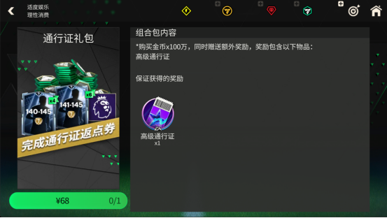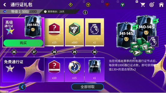 付费通行证中,玩家可以获得4名7阶140-145混合球员、6名7阶141-145混合球员在内的球员卡奖励,并赠送680点券。
