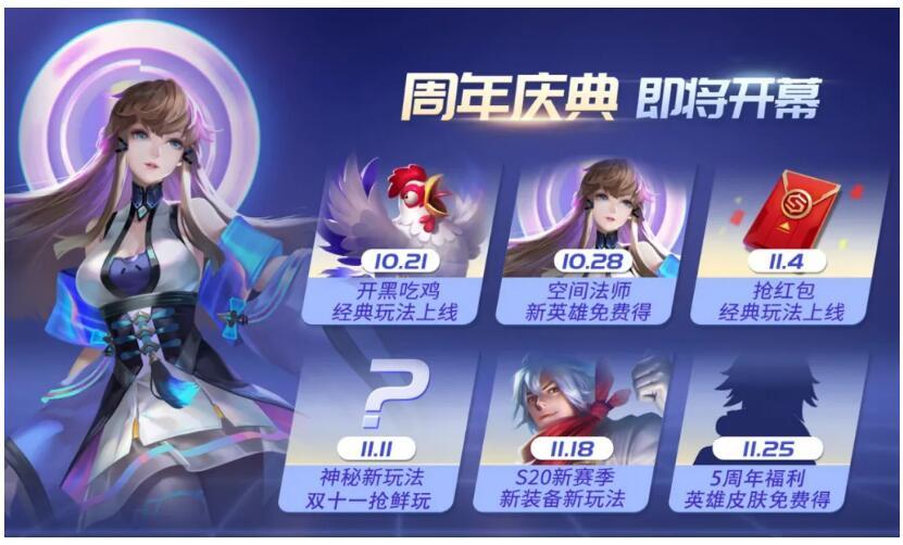 离五周年庆典还剩两周,周年庆版本将免费送新英雄和皮肤,同时在接下来的时间里还将有新英雄免费拿、11月11日激爽玩法、11月18日新赛季即将上线,更多福利和好玩的内容见游戏内“五周年倒计时”页签。