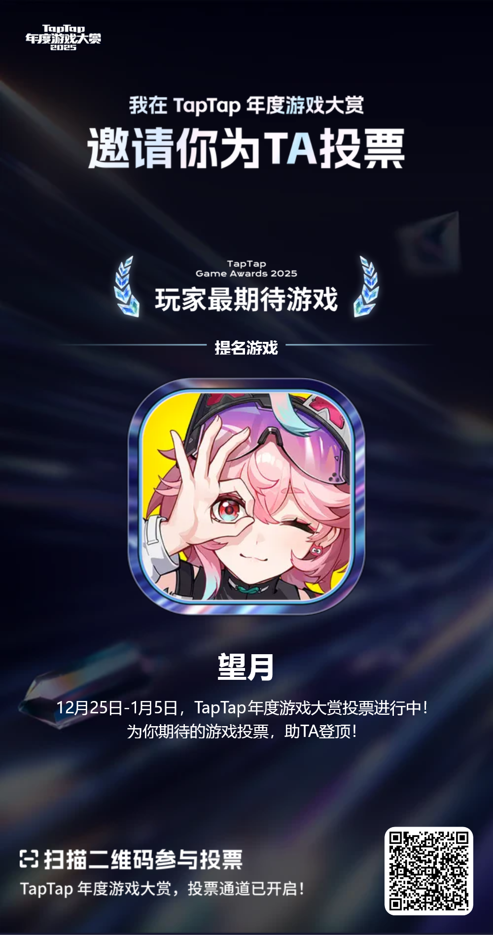 TapTap 2025年度游戏大赏已正式开启投票!过去的一年中,《望月》得到了许多喜爱与期望,成功入选「玩家最期待游戏」 奖项提名名单,快来点击投票链接为我们投上一票,还有机会赢我们准备的精美礼物哦!