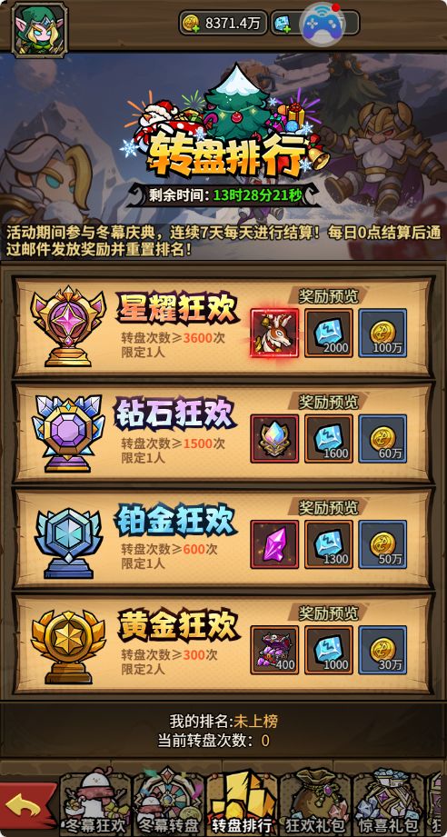 活动期间,满足抽奖次数即可榜上有名,每日刷新排行榜,按排名发放奖励。第一名奖励只有一名。最高奖励:麋鹿(圣诞限定),拥有强力技能“鹿神恩眷”。有实力的玩家可以冲榜,目标获取顶级道具。